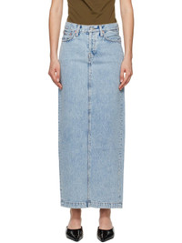 Non-stretch 14 oz denim skirt. Fading throughout. · Belt loops · Five-pocket styling · Button-fly · Leather logo patch at back waistband · Central vent at back hem · Contrast stitching in beige Supplier color: Blue 100% cotton. Made in Turkey 242277F093000