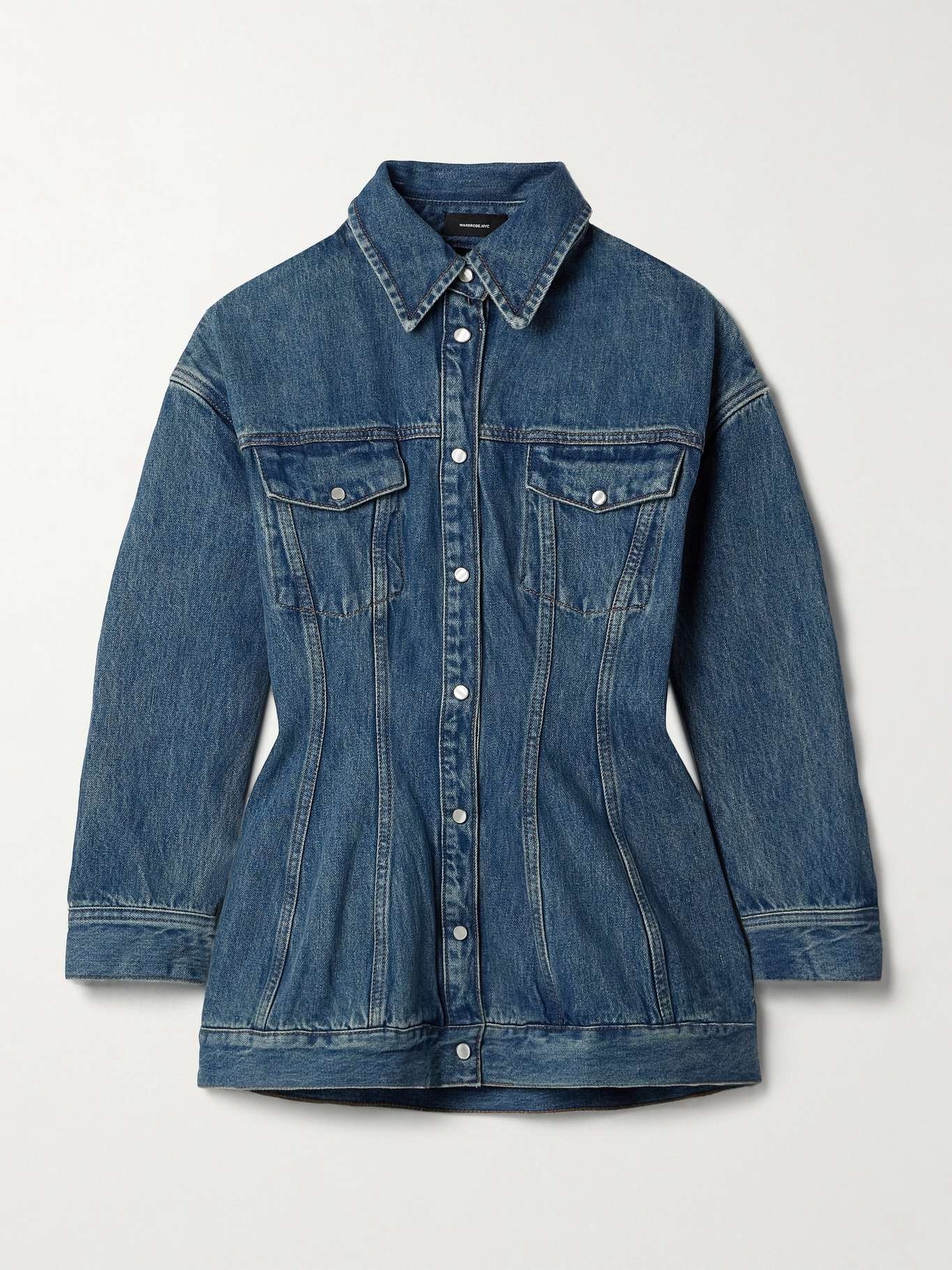 EDITORS'NOTES WARDROBE.NYC's denim 'Contour' jacket has curved seams through the bodice to create an hourglass shape. Style yours with jeans in a similar wash. SIZE & FIT Model measurements: - Fits true to size, take your normal size - Those with a curvy figure may wish to take the next size up - Tailored for a slim fit - Slightly short in the sleeves - Mid-weight, non-stretchy denim - Model is 180cm/ 5'11" and is wearing a size Small - Bust: 80cm/ 31.5" - Waist: 70cm/ 27.5" - Hip: 93cm/ 36.5" DETAILS & CARE - Blue denim - Snap fastenings through front - 100% cotton - Machine wash