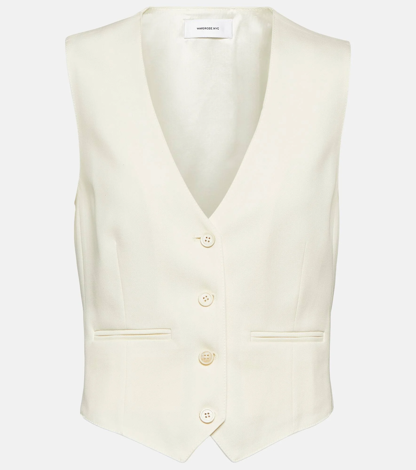 Wardrobe.NYC's elegant everyday essentials are produced in limited quantities with versatility, supreme quality, and modern urban life at their core. Shaped for a slim, cropped fit with a cinchable, belted back, this vest is tailored from pure wool with vertical darting and welt pockets. Product Details - Made in Slovakia - Material: 100% virgin wool - Designer color name: Off White - Closure: buttoned front - Pockets: welt pockets - Lining: 100% viscose - Item number: P00802228 Size & Fit - True to size - Cinched waist - Mid-weight material - Cropped - The model seen in the picture is 178cm-5'10" and wearing a size XS