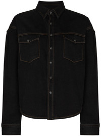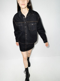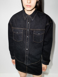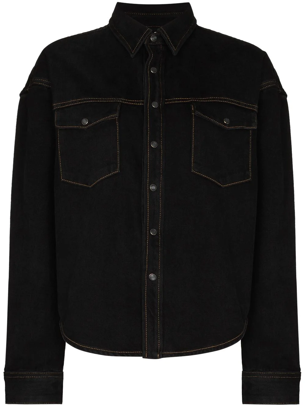 oversized denim button jacket Self-described as a 'conceptual composite of luxury essentials', Wardrobe.NYC offers streetwear-inspired pieces with a modern twist. Made from cotton, this buttoned shirt is part of the brand's SS21 collection and cut for an oversized fit. It fastens at the front with snap buttons and features classic flap pockets at the chest. Highlights - Black - Cotton - Oversized - Front button fastening - Classic collar - Two chest flap pockets - Long sleeves - Buttoned cuffs - Curved hem Made in United States Composition Cotton 76%, Recycled Cotton 13%, Recycled Polyester 11% SIZE & FIT Model measurements Height 5 ft 11 in(1.8 m) Bust/Chest 31.49 in(80 cm) Hips 36.22 in(92 cm) Waist 25.59 in(65 cm) FittingInformation This piece fits true to size. We recommend you get your regular size Cut for a loose fit Made with a mid-weight fabric Washing instructions Hand Wash