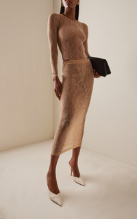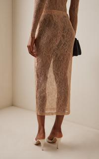 The brainchild of Vogue Australia stylist Christine Centenera and designer Josh Goot, Wardrobe.NYC represents the ultimate in luxurious staples. The Lace Skirt introduces the label's coveted Italian stretch lace in a refined column silhouette for easy slip-on styling. Features include a high elasticized waistband and a straight hem for versatile wear. The midi length offers timeless appeal. PRODUCT DETAILS - Resort '26 - Pull on - Composition: 85% polyamide, 15% elastane - Dry clean - Made in Portugal