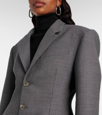 Wardrobe.NYC's elegant everyday essentials are produced in limited numbers with the needs of modern life in mind. This blazer is tailored from virgin wool to a structured longline silhouette, complemented by a peplum. Product Details - Material: 100% virgin wool - Care instructions: dry clean - Made in Slovakia - Color: grey - Designer color name: Charcoal - Item color: gray - Lining: 100% viscose - Notched lapel - Shoulder pads - Closure: single-breasted (three buttons) - Pockets: breast pocket, flap pockets, internal pocket - Cuff: buttoned - Vent: single - Item number: P01113685 Size & Fit - True to size - Shoulder pad inserts - Cinched waist - Non-stretchy fabric - Falls below the hip - The model seen in the picture is 178cm-5'10" and wearing a size XS