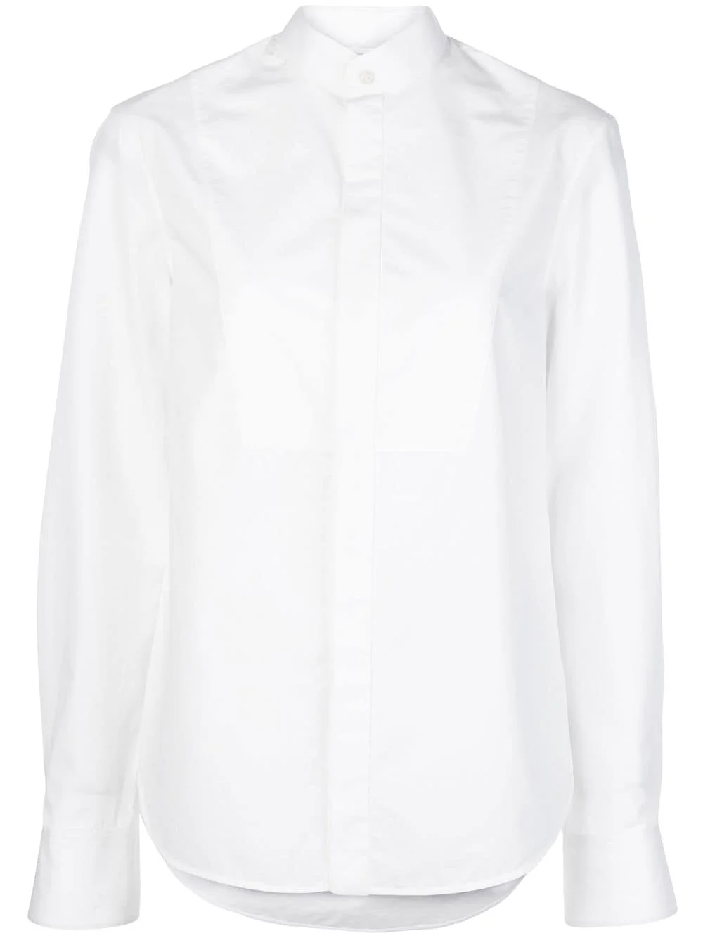 Release 05 shirt White cotton Release 05 shirt from Wardrobe.Nyc featuring a buttoned mandarin collar, a concealed front button placket, long sleeves, a curved hemline and tuxedo bib at the chest. Imported Composition pure cotton 100% SIZE & FIT Measurement CHEST 36.22 in(92 cm) HIPS 38.58 in(98 cm)