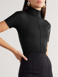 EDITORS'NOTES Designed in collaboration with model and entrepreneur Rosie Huntington-Whiteley, Wardrobe.NYC's bodysuit is meant to slot effortlessly into your busy lifestyle, creating the foundation for countless outfits. It's made from panels of stretch-jersey that meet at the elongating center seam and has a mock neckline. SIZE & FIT Model measurements: - Fits true to size, take your normal size - Designed for a close fit - Minimal brief coverage - Lightweight, stretchy fabric - Model is 175cm/ 5'9" and is wearing a size Small - Bust: 78cm/ 31" - Waist: 62cm/ 24.5" - Hip: 92cm/ 36" DETAILS & CARE - Black stretch-jersey - Snap fastenings at base - 84% polyamide, 16% elastane - Machine wash
