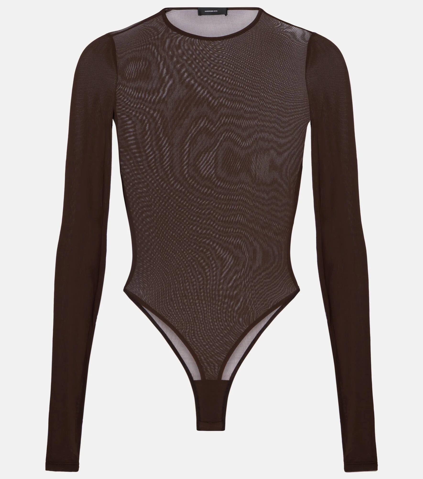Turn to Wardrobe.NYC for modern separates, like this bodysuit. The long-sleeve style is made from delicate sheer fabric to a skintight silhouette and features a classic round neck. Product Details - Material: 86% viscose, 14% elastane - Care instructions: machine wash cold - Made in Portugal - Designer color name: Dark Brown - Item color: brown - Closure: snap-buttoned fastenings - Item number: P01113692 Size & Fit - True to size - Sheer - Fitted - Stretchy fabric - High-cut leg - The model seen in the picture is 178cm-5'10" and wearing a size XS