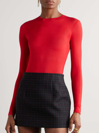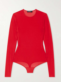 EDITORS'NOTES WARDROBE.NYC's bodysuit is made from sheer stretch-jersey that's tissue-thin and lightweight. It's designed for a close fit and has an undetectable thong base that ensures a smooth, comfortable finish. Wear yours with everything from tailoring to jeans, opting for a tonal bra for added coverage. SIZE & FIT - Fits true to size, take your normal size - Designed for a close fit - Minimal brief coverage - Lightweight, sheer, stretchy fabric - S/M/L sizing DETAILS & CARE - Red stretch-jersey - Snap fastenings at base - 86% viscose, 14% elastane - Machine wash