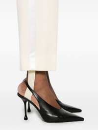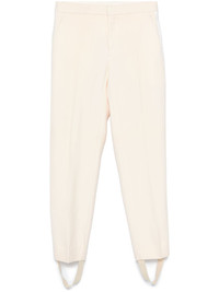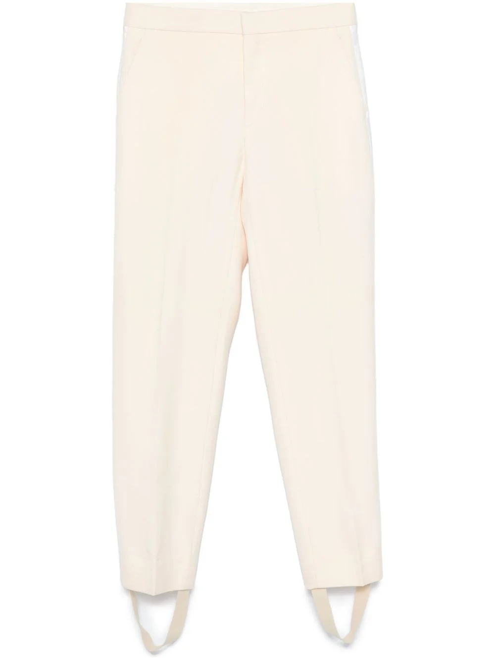 Tuxedo trousers Highlights - Light beige - Concealed front fastening - Two side slash pockets - Two rear welt pockets - Detachable stirrup at hem Imported Composition Outer: Virgin Wool 100%, Silk 100% Lining: Viscose 100% SIZE & FIT Model measurements Height 5 ft 11 in(1.8 m) Bust/Chest 31.49 in(80 cm) Hips 36.61 in(93 cm) Waist 24.4 in(62 cm) FittingInformation Designed for a tapered fit, these trousers allow for a close fit at the waist and a loose unrestricted fit over the leg with a closer fit towards the ankle The elasticated stirrups allow for a close and secure fit Made from a midweight non-stretch fabric, this piece offers minimal elasticity when worn