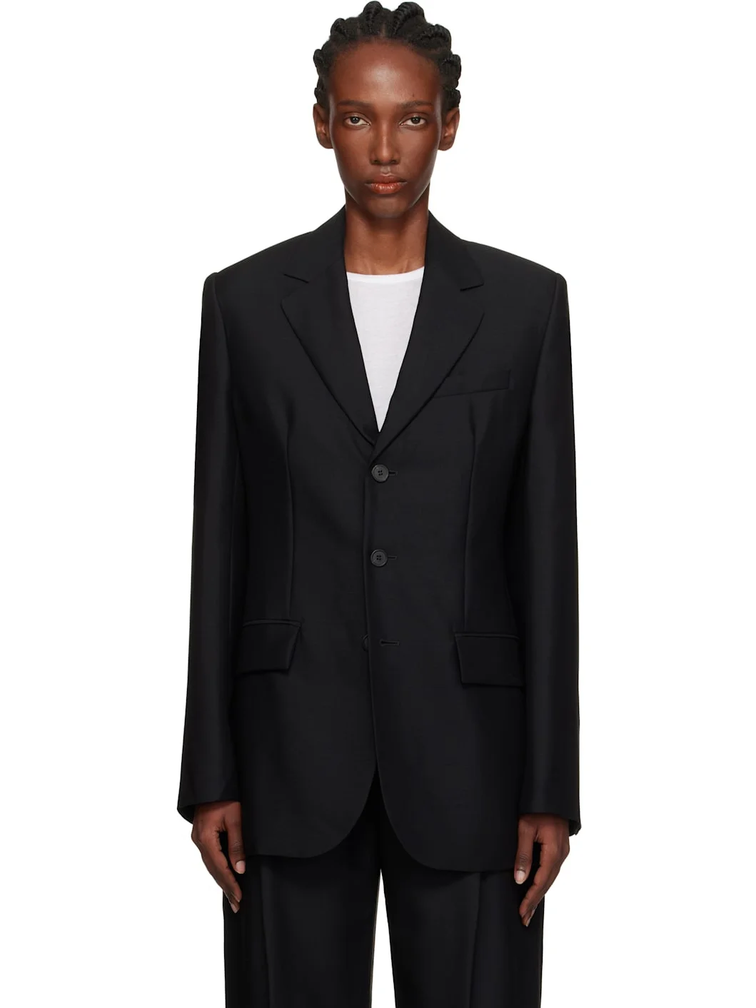 Malfile mohair-blend twill blazer. · Notched lapel · Button closure · Welt pocket at chest · Mock flap pockets at waist · Padded shoulders · Vented cuffs · Central vent at back hem · Welt pocket at interior · Full satin lining Supplier color: Black Body: 51% mohair, 43% wool, 6% polyamide. Lining: 100% viscose. Made in Italy 252277F057002