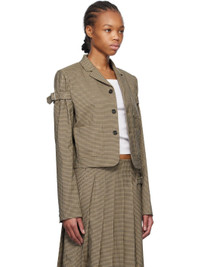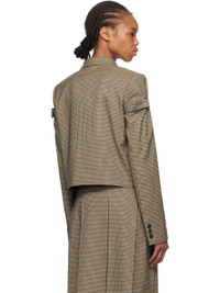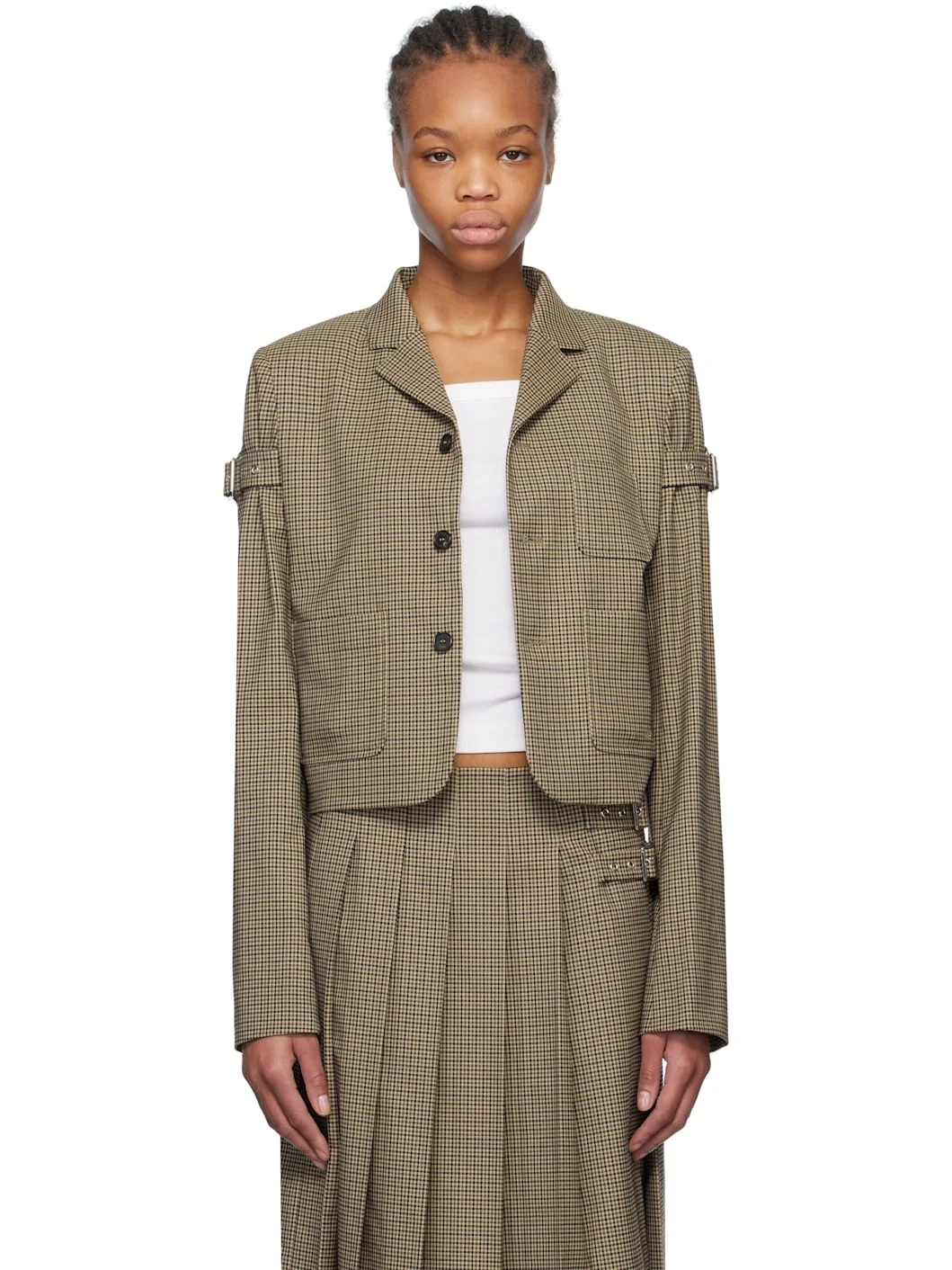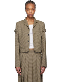 Stretch polyester-blend twill blazer. Check pattern throughout. · Notched lapel · Button closure · Patch pockets · Logo embroidered at front · Cropped hem · Padded shoulders · Integrated pin-buckle strap at sleeves · Three-button surgeon's cuffs · Full logo-woven satin lining Supplier color: Beige Body: 63% polyester, 34% rayon, 3% polyurethane. Lining: 50% polyester, 50% viscose. Made in South Korea 251327F057002