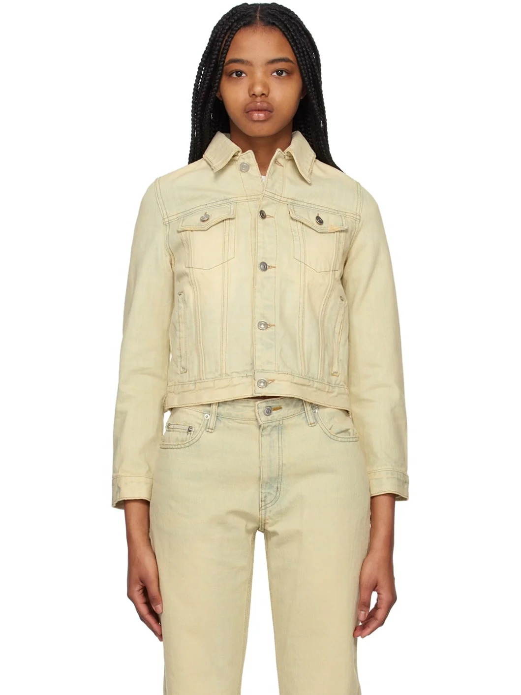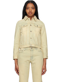 Non-stretch denim jacket. Fading and distressing throughout. · Spread collar · Button closure · Flap pockets at chest · Welt pockets · Single-button fastening at cuffs · Adjustable button tabs at back hem · Patch pockets at interior · Contrast stitching in brown Supplier color: Beige 100% cotton. Made in South Korea 231327F060000
