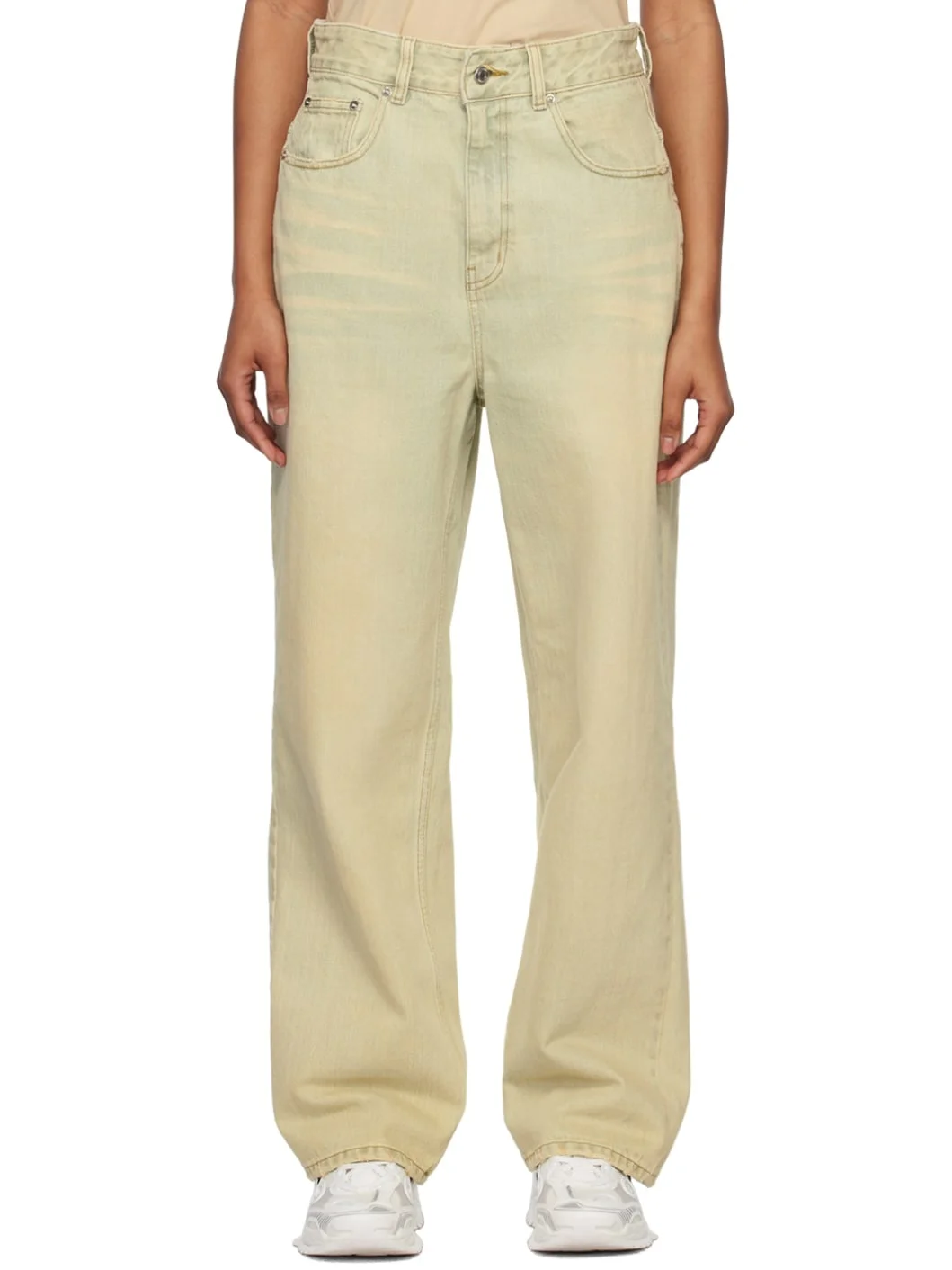Wide-leg non-stretch denim jeans. Fading, whiskering, and distressing throughout. · Belt loops · Five-pocket styling · Zip-fly · Logo-engraved silver-tone hardware Supplier color: Beige 100% cotton. Made in South Korea 231327F069000
