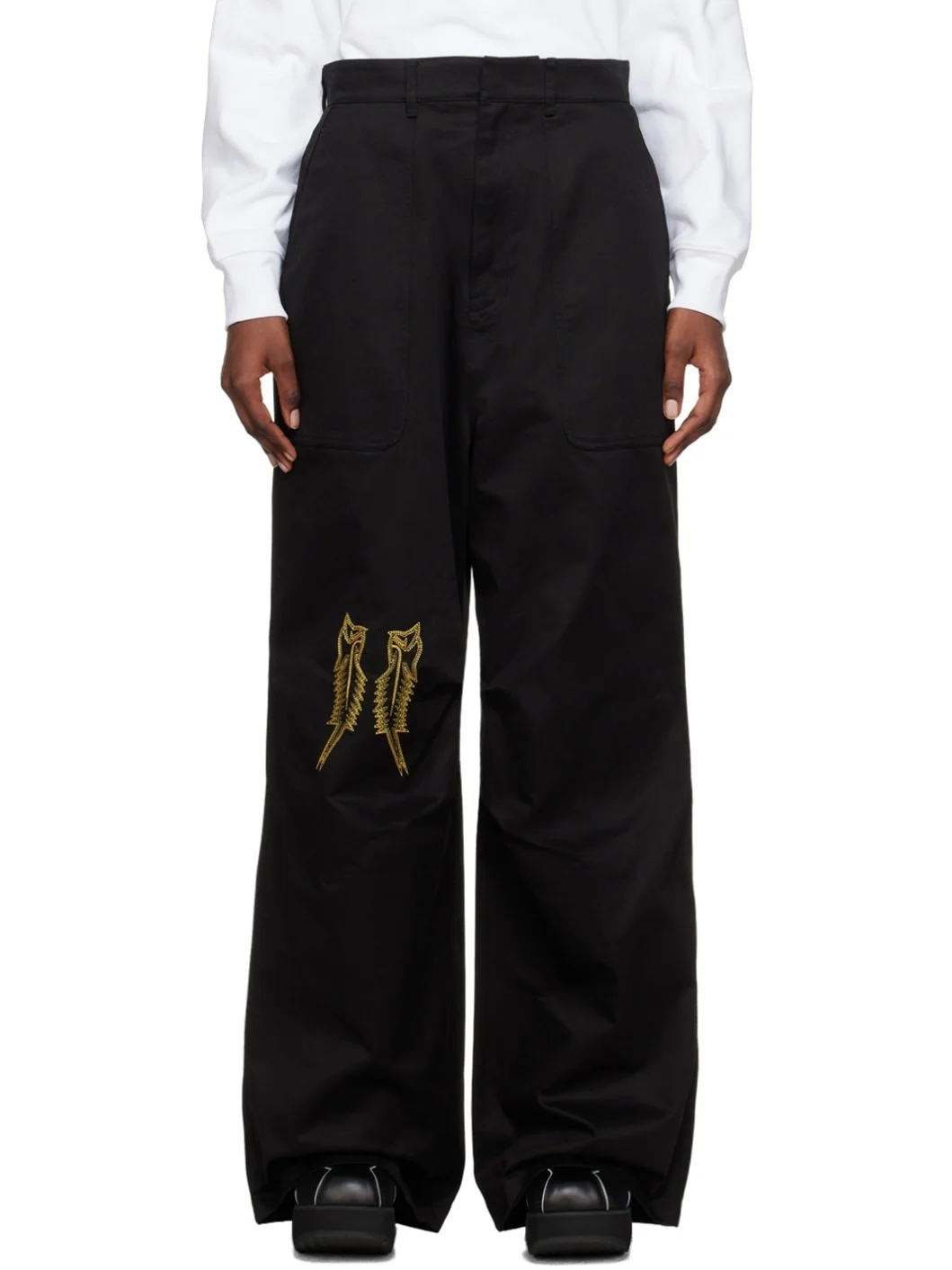 Cotton gabardine trousers. · Belt loops · Four-pocket styling · Zip-fly · Graphic embroidered at leg · Darts at knees Supplier color: Blk 100% cotton. Made in South Korea 231327F087008