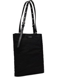 Padded technical satin tote in black. · Adjustable twin shoulder straps · Metal discs at face · Logo patch at back face · Magnetic closure · Zip pocket at interior · Card slot at interior · Full twill lining · H12" x W16" Supplier color: Black Textile. Made in South Korea 251327F049000