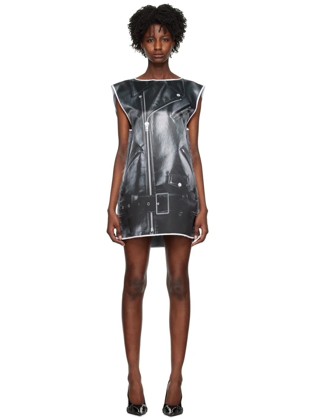 Polyester satin dress. Trompe l'oeil graphic pattern and fraying throughout. · Crewneck · Raw edge at hem and armscyes · Unlined Supplier color: Black 100% polyester. Made in South Korea 231327F111000