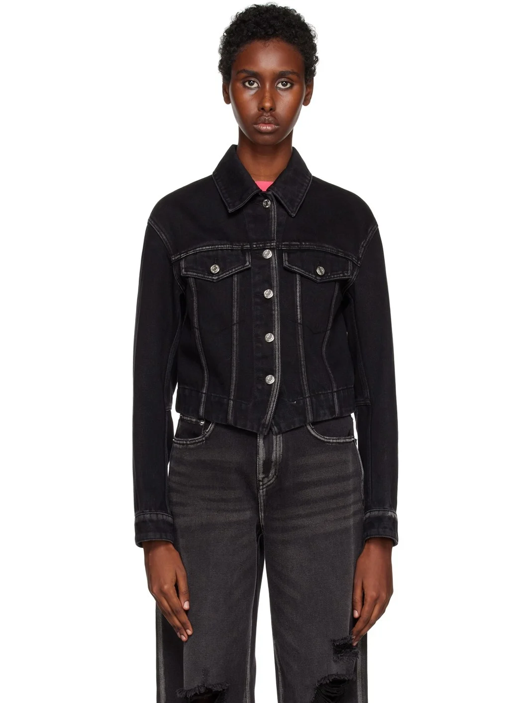 Non-stretch denim jacket. Fading throughout. · Spread collar · Button closure · Flap pockets at chest · Single-button barrel cuffs · Unlined Supplier color: Black 100% cotton. Made in South Korea 222327F060003