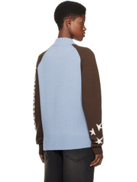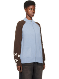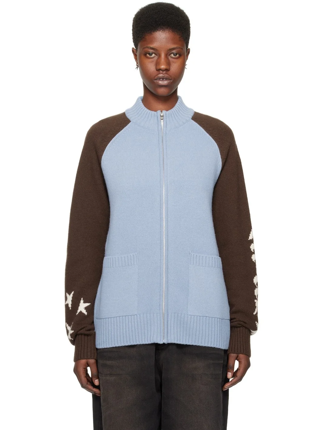 Knit wool jacket. · Rib knit mock neck, hem, and cuffs · Zip closure · Patch pockets · Raglan sleeves · Intarsia logo at sleeve · Intarsia graphics at sleeves Supplier color: Sky 100% wool. Made in South Korea 241327F063002