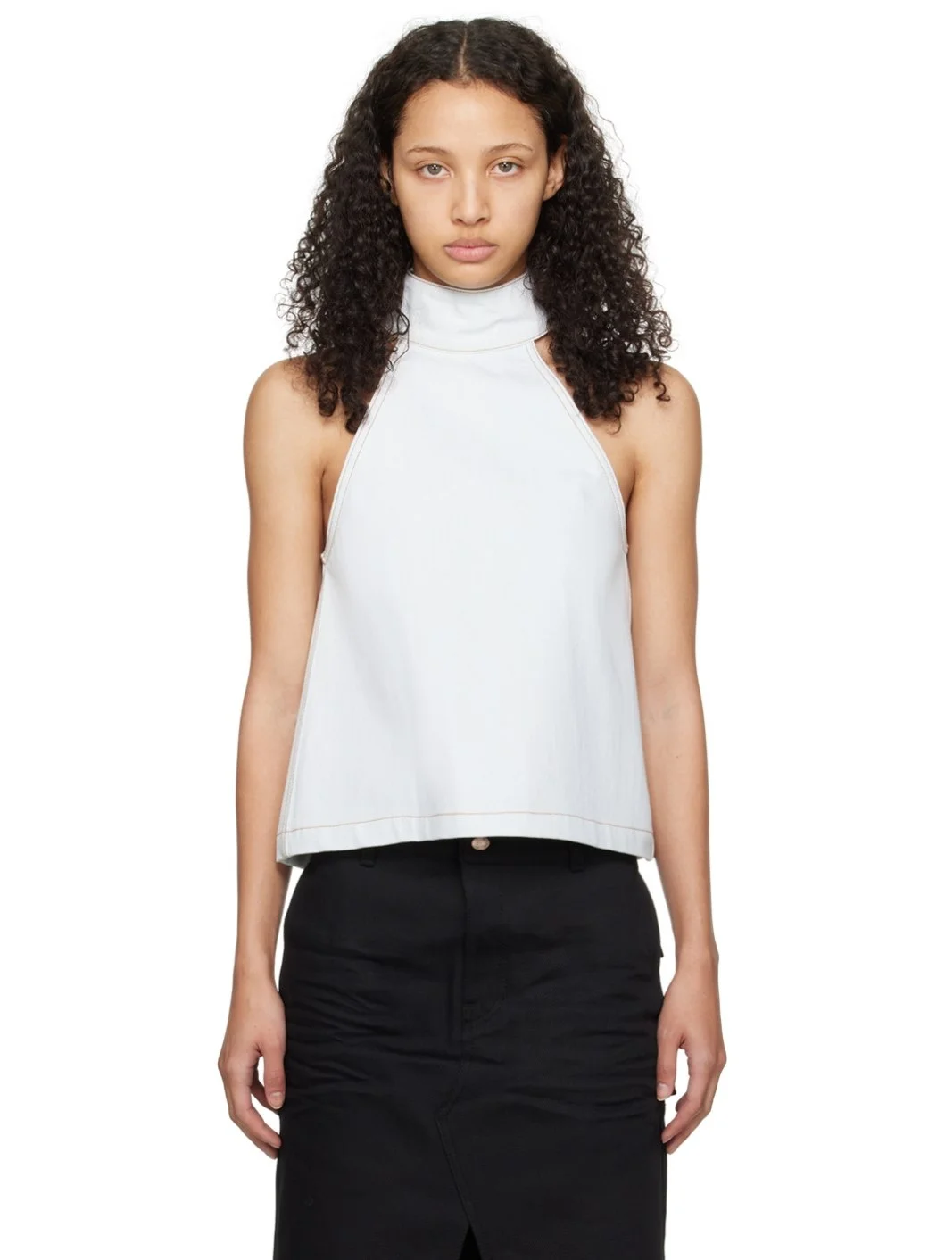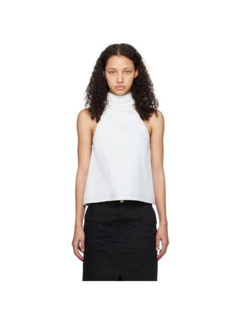 Non-stretch denim tank top. Fading throughout. · Press-stud fastening at halter neck · Dropped armscyes · Central inverted box pleat at back · Contrast stitching in brown Supplier color: Ice 100% cotton. Made in South Korea 241327F111007