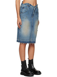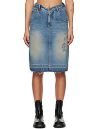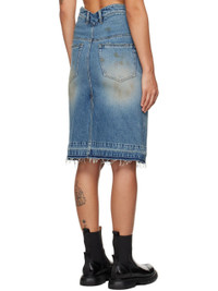 Non-stretch denim midi skirt. Whiskering, fading, and distressing throughout. · Mid-rise · Belt loops at sweetheart waist · Five-pocket styling · Zip-fly · Frayed hem · Central vent at back hem · Logo-engraved brass- and gold-tone hardware · Contrast stitching in tan Supplier color: Blue 100% cotton. Made in South Korea 242327F092009