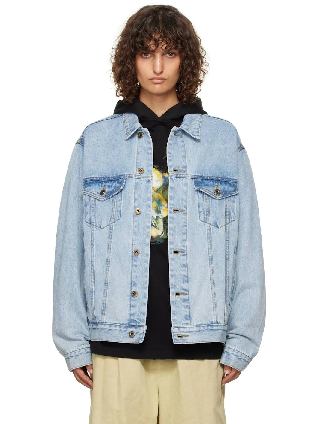 Non-stretch denim jacket. Fading throughout. · Paneled construction · Spread collar · Button closure · Flap and welt pockets at front · Dropped shoulders · Single-button barrel cuffs · Printed graphic with crystal-cut accents at back · Embroidered logo at back hem · Adjustable button tabs at back hem Supplier color: Blue 100% cotton. Made in South Korea 242327F060003