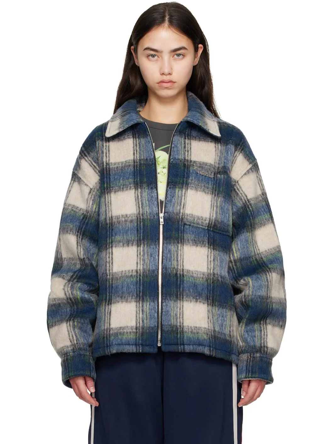 Brushed melton jacket. · Jacquard check pattern throughout · Spread collar · Zip closure · Logo hardware and patch pocket at chest · Seam pockets at waist · Buttoned barrel cuffs · Logo printed at back · Box pleat at back yoke · Full satin lining Supplier color: Blue Body: 100% polyester. Lining: 52% viscose, 48% polyester. Made in South Korea 252327F063007