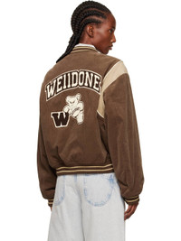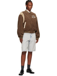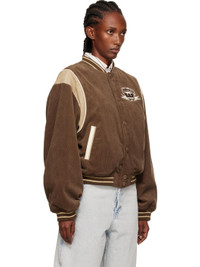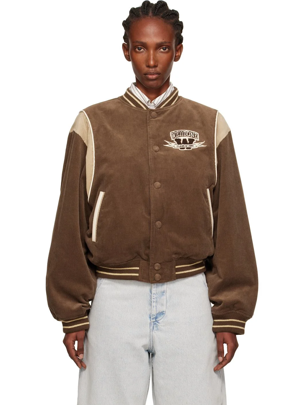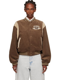 Cotton corduroy bomber jacket. · Striped rib-knit stand collar, hem, and cuffs · Press-stud closure · Boucle logo applique at chest and back · Faux-leather trim at welt pockets · Faux-leather piping at shoulders · Welt pockets at interior · Full satin lining Supplier color: Brown Body: 100% cotton. Trim: 100% cotton. Lining: 52% viscose, 48% polyester. Made in South Korea 252327F058000