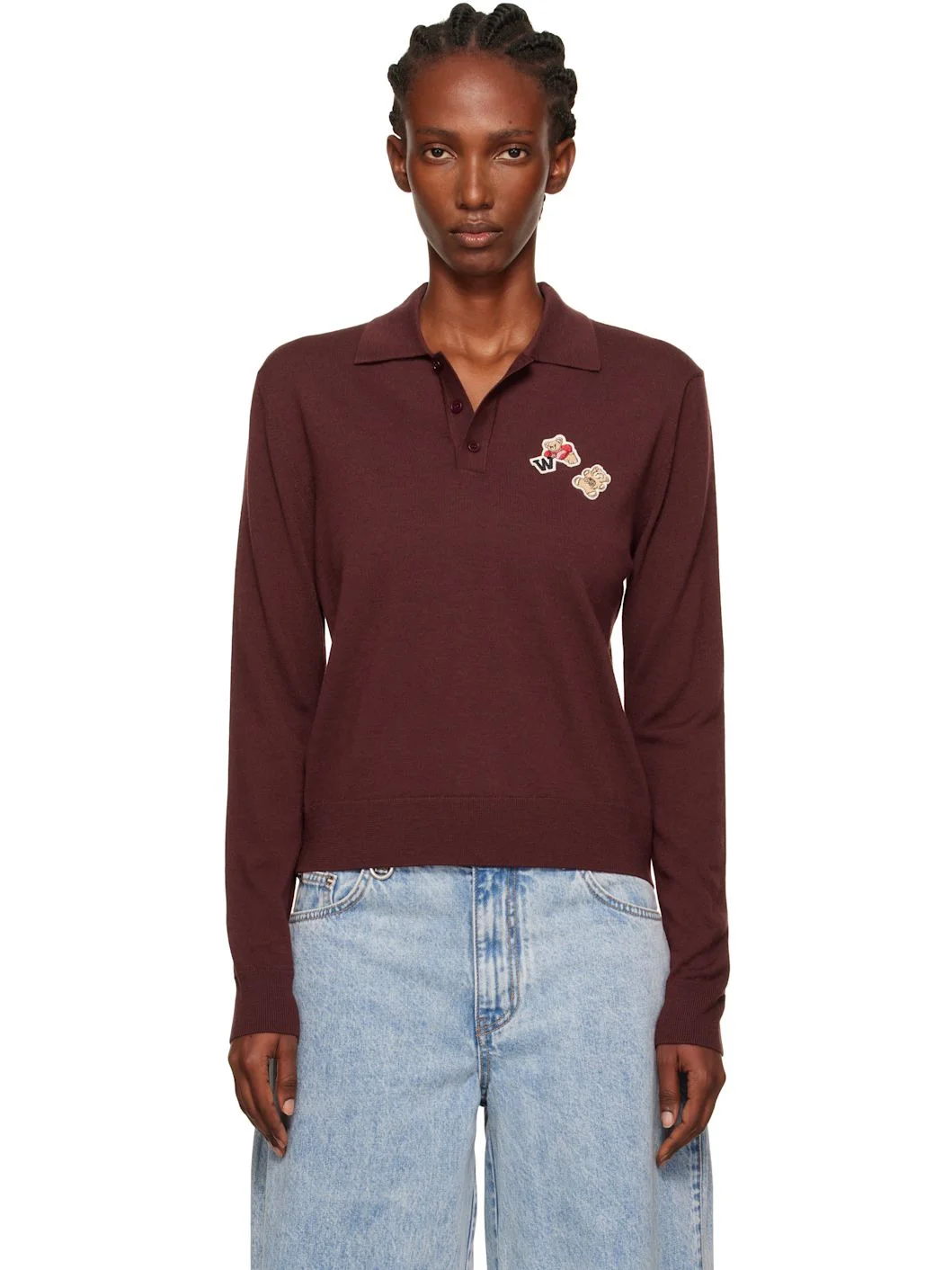 Knit wool polo. · Rib-knit spread collar, hem, and cuffs · Three-button placket · Embroidered logo patches at chest Supplier color: Wine 100% wool. Made in South Korea 252327F108001