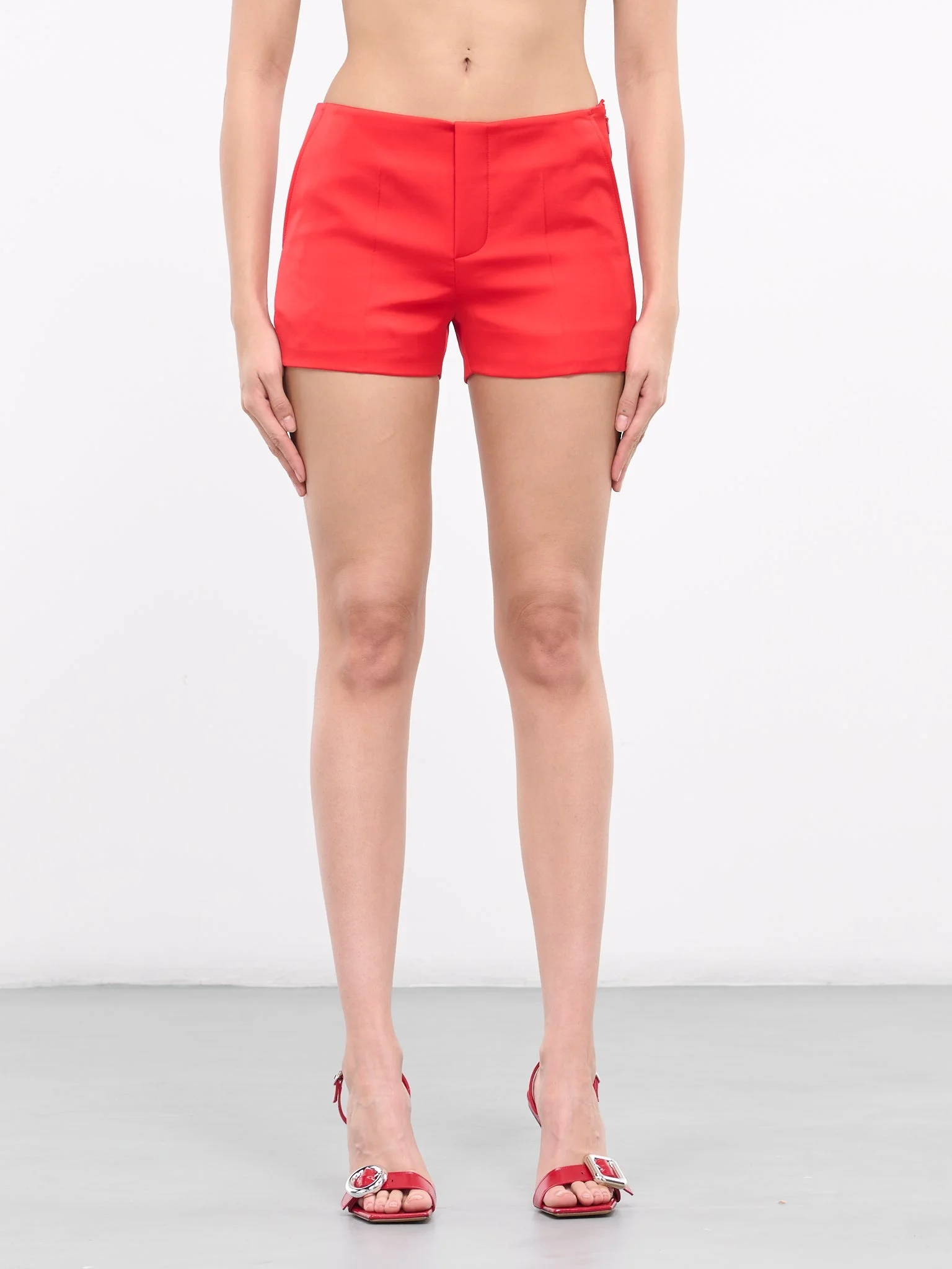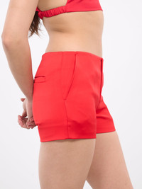 WE11DONE shorts in red, paneled satin construction, low-rise, front concealed zip fly, inset pockets, side concealed zip closure, back welt pockets, mini-length, slim fit. Made in Korea 100% Polyester Standard Sizing Model is 5'8" wearing size S. Bust: 32" Waist: 26" Hips: 34.5"