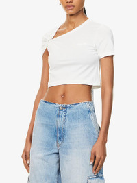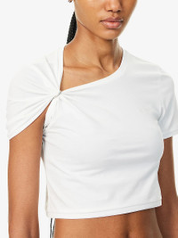 PRODUCT DETAILS - We11done cotton-blend stretch-jersey T-shirt - 77% cotton, 23% polyester - Slips on - Regular fit, cropped length, round neck, asymmetric gather with hardware trim at neckline, short sleeves, brand embroidery at chest, ribbed trims - Hand wash - True to size - Model is 5ft 10in/1.78m and wears a size small - Lightweight, slight stretch Ref: R04443977