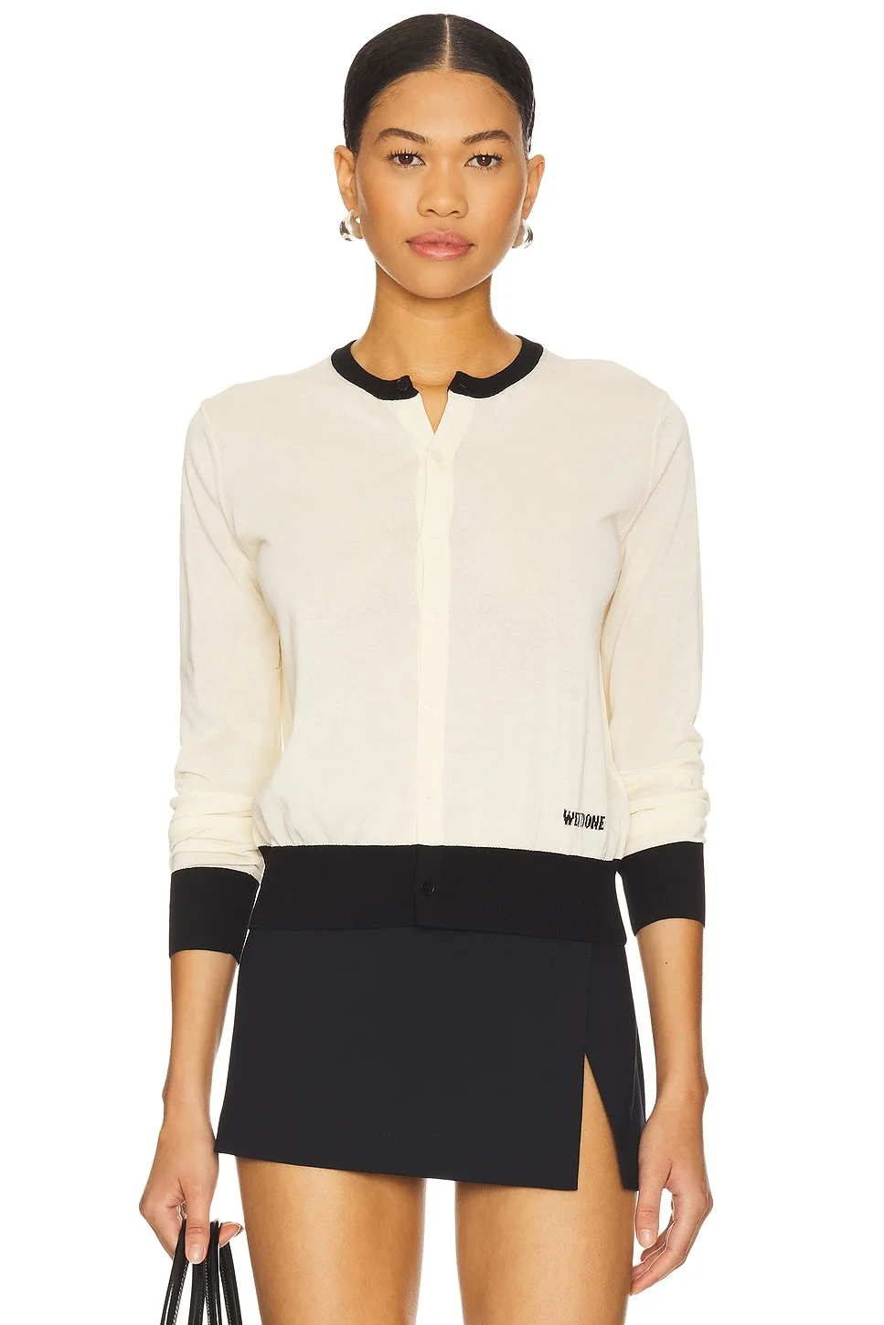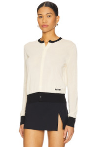 - 61% cotton 39% nylon - Hand wash cold - Front button closure - Colorblocked trim - Front embroidered logo detail - Lightweight fully fashion knit fabric - Garment is made with a semi-sheer fabric, undergarments can show through - Revolve Style No. WE1R-WK1 - Manufacturer Style No. WD-KC1-25-610-W-YE