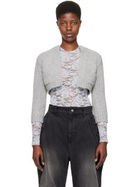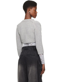 Knit wool- and alpaca-blend cardigan. · Rib knit crewneck, open front, hem, and cuffs · Patch pockets · Logo embroidered at front hem Supplier color: Gray 78% wool, 15% alpaca, 7% nylon. Made in South Korea 241327F095001