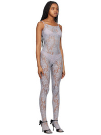 Semi-sheer knit stretch nylon jumpsuit. Jacquard floral pattern throughout. · Scoop neck · Integrated feet · Fixed spaghetti shoulder straps · Low back Supplier color: Grey