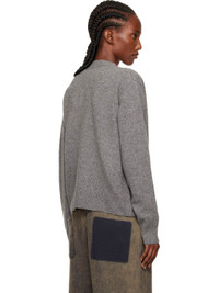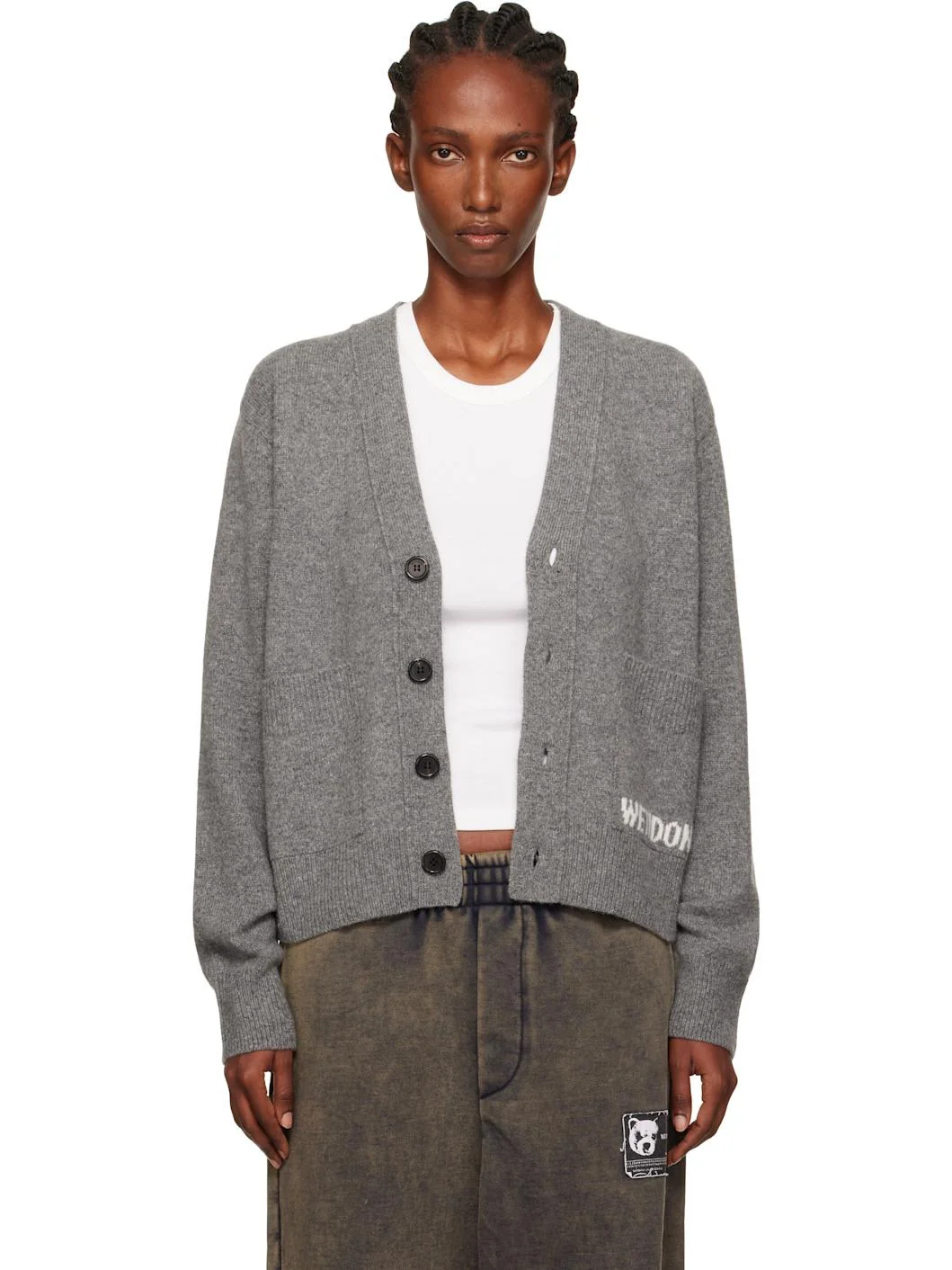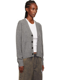Brushed knit wool-blend cardigan. · Rib-knit Y-neck, hem, and cuffs · Button closure · Patch pockets at waist · Intarsia logo at pocket Supplier color: Charcoal 80% wool, 20% nylon. Made in South Korea 252327F095004
