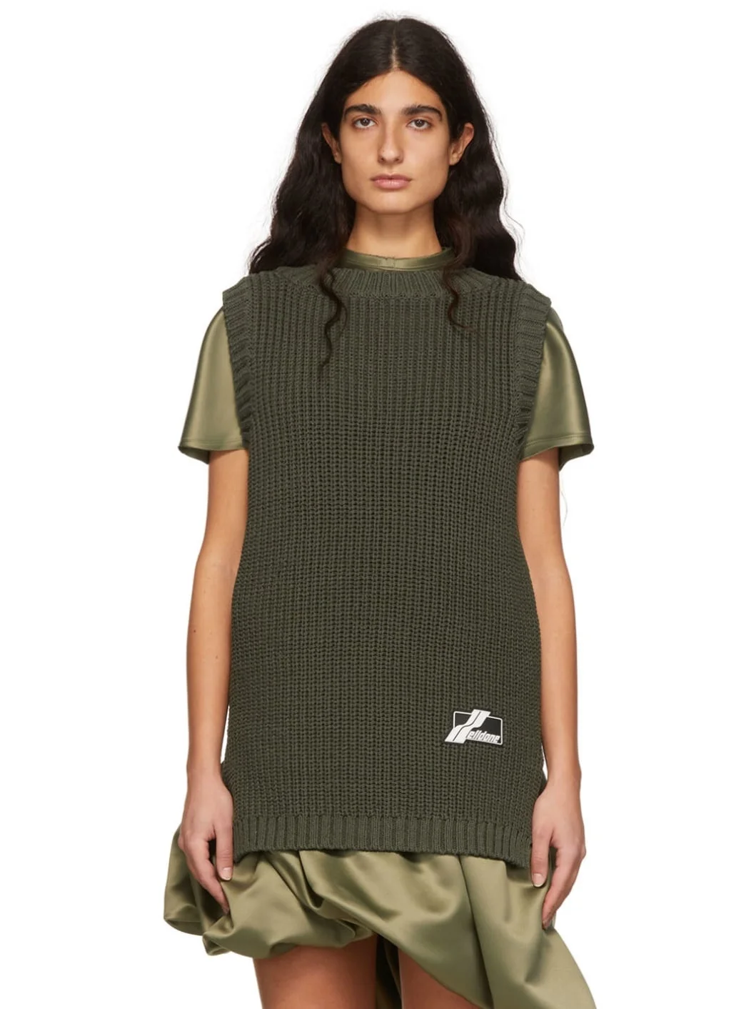 Rib knit and seed stitch knit cotton vest. · Vented side-seams · Rib knit crewneck, armscyes, and hem Supplier color: Khaki 100% cotton.