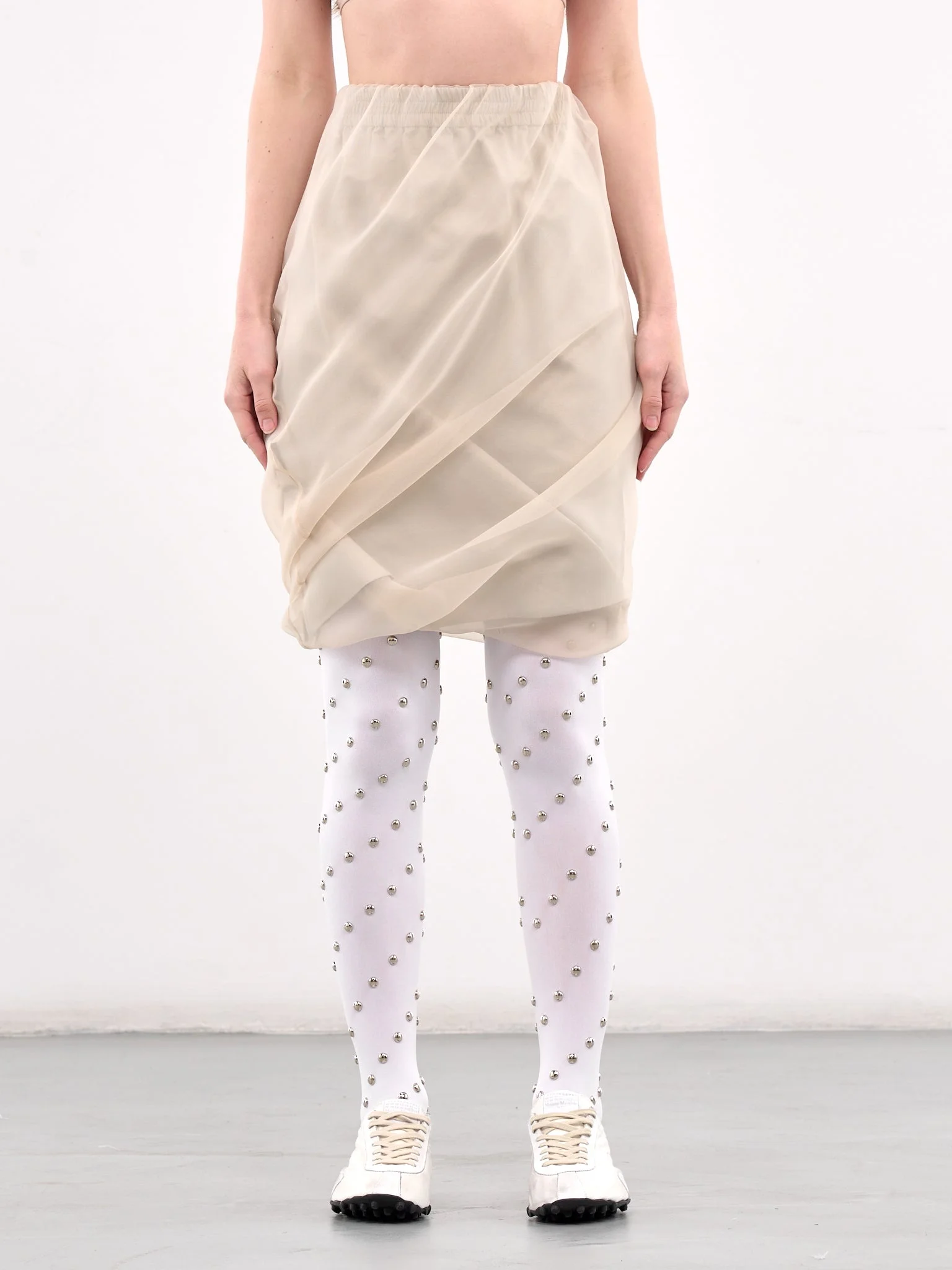 WE11DONE skirt in beige, layered mesh & cotton-blend construction, semi-sheer mesh overlay, high waist, elasticated waistband, gathering & draping, straight hem, lined, mini-length, slim fit. Made in Korea Outer: 100% Polyester Inner: 72% Cotton 28% Nylon Standard Sizing Model is 5'7" wearing size S. Bust: 30" Waist: 24" Hips: 35"