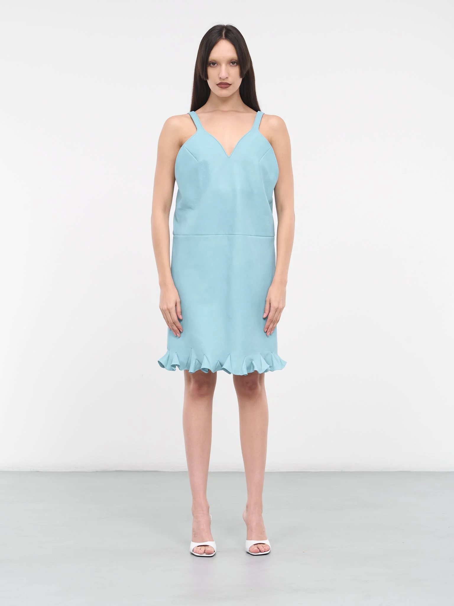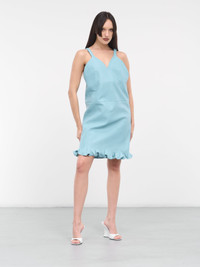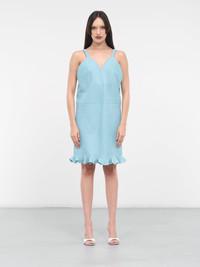 WE11DONE dress in sky blue, paneled leather construction, sweetheart neckline, shoulder straps, sleeveless, armscyes, hem godet detailing, mini-length, relaxed fit. Made in Korea 100% Leather Standard Sizing Model is 5'8" wearing size XS. Bust: 32" Waist: 26" Hips: 34.5"
