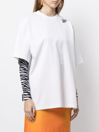 logo-print oversized T-shirt white/black cotton logo print to the side crew neck drop shoulder short sleeves straight hem Imported Composition Cotton 100% SIZE & FIT Model measurements Height 5 ft 11 in(1.8 m) Bust/Chest 31.49 in(80 cm) Hips 35.03 in(89 cm) Waist 23.62 in(60 cm) Measurement CHEST 51.96 in(132 cm) SLEEVE LENGTH 11.02 in(28 cm) LENGTH 29.92 in(76 cm) Shoulder Width 23.62 in(60 cm) FittingInformation This piece fits true to size. We recommend you get your regular size Cut for an oversized fit Made with a mid-weight fabric