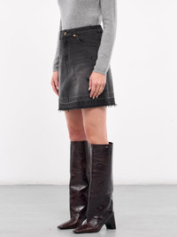 WE11DONE skirt in black, paneled denim construction, fading & distressing, belt loops, back logo patch, front button & concealed zip fly closure, inset pockets, coin pocket, back patch pockets, raw hems, straight hem, mini-length, slim fit. Made in Korea 72% Cotton 26% Polyester 2% Cellulose Standard Sizing Model is 5'8" wearing size S. Bust: 32" Waist: 24" Hips: 33"