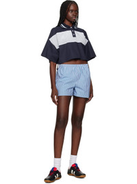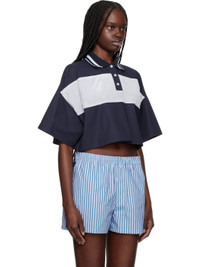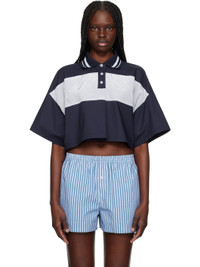 Stretch rayon-blend poplin polo. · Striped rib-knit spread collar · Three-button placket · Lace-up detailing side seams Supplier color: Navy 68% rayon, 28% polyester, 4% polyurethane. Made in South Korea 251327F108003