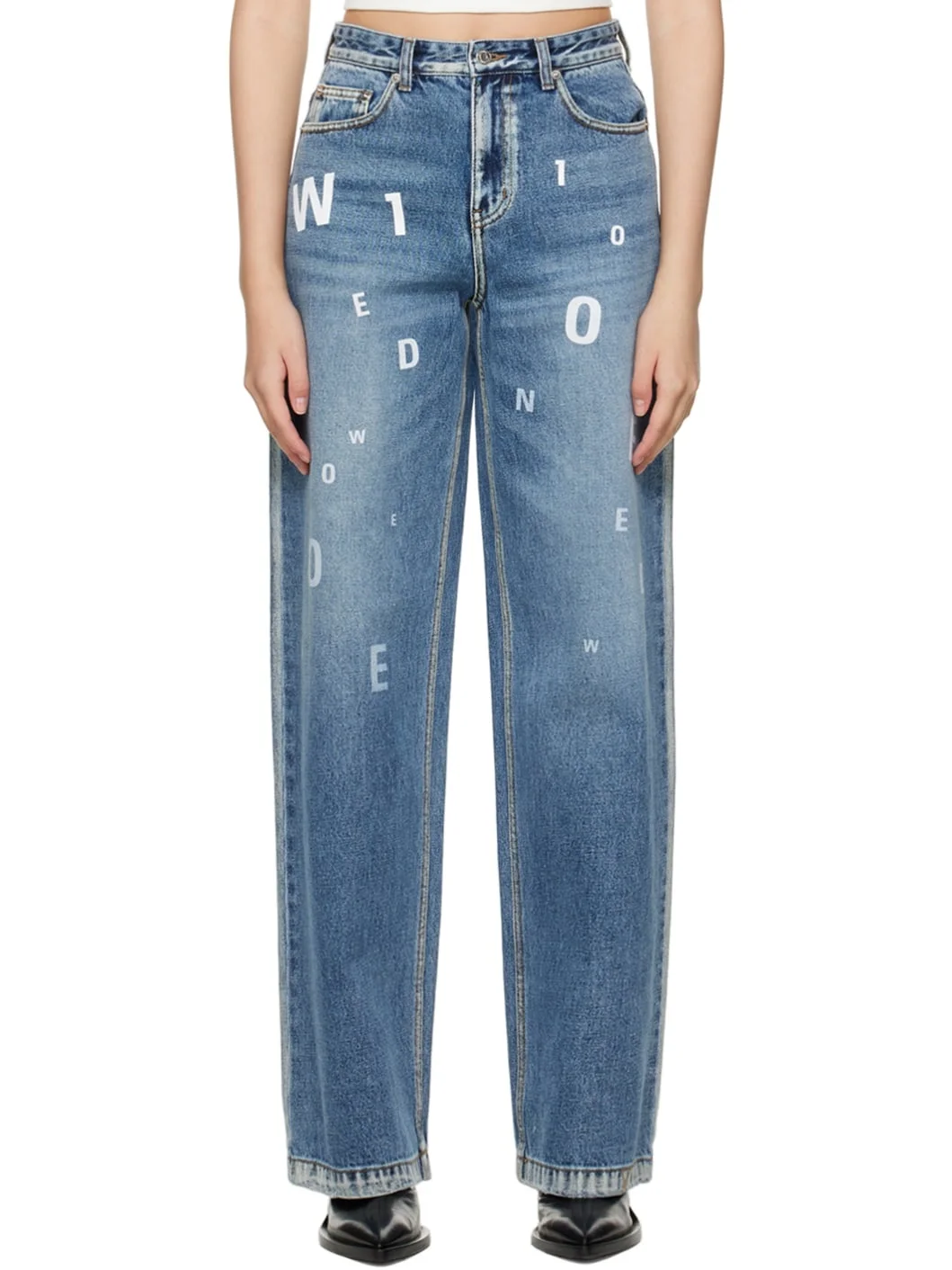 Non-stretch denim jeans. Logo pattern and fading throughout. · Belt loops · Five-pocket styling · Zip-fly Supplier color: Navy 100% cotton. Made in South Korea 222327F069003