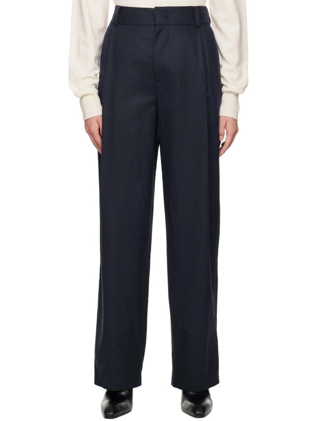Stretch wool-blend twill trousers. · Low-rise · Belt loops · Four-pocket styling · Zip-fly · Pleats at front waistband · Raw edge at cuffs Supplier color: Navy 92% wool, 6% polyamide, 2% polyurethane. Made in South Korea 222327F087005