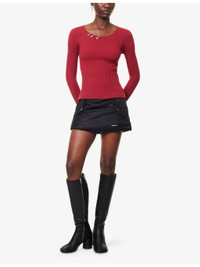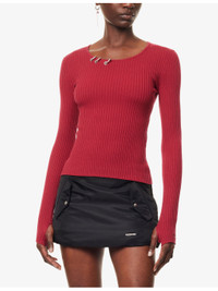 PRODUCT DETAILS - WE11DONE knitted top - 70% lyocell, 30% polyester - Slim fit, detachable branded piercing embellishment at round-neck, long sleeves, thumbhole cuffs, brand embroidery at cuff, all-over knitted and ribbed - Hand wash cold - True to size - Model is 5ft 10in/1.78m and wears a size small - Lightweight, stretchy Ref: R04485083