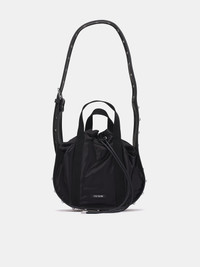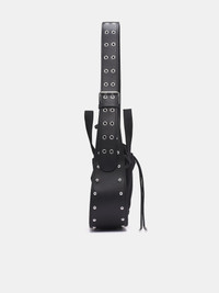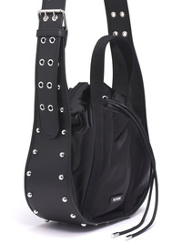 WE11DONE bag in black, nylon & leather construction, double metal eyelet leather belt strap, studded belt embellishment, adjustable pin-buckle fastening, top cinched drawstring opening, twin webbing handles, face logo patch, lining. Made in China 50% Polyester 40% Sheepskin 10% Cowskin One Size
