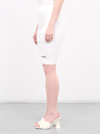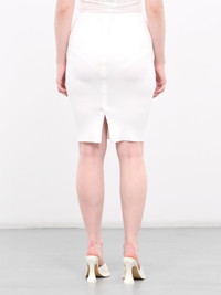 WE11DONE skirt in white, pencil skirt design, viscose-poly blend, paneled knit construction, rib-knit, fitted waist, back buttoned placket closure, back vent, front logo detailing, straight hem, knee-length, slim fit. Made in Korea 72% Viscose 28% Polyester Standard Sizing Model is 5'8" wearing size S. Bust: 30" Waist: 24" Hips: 33.5"