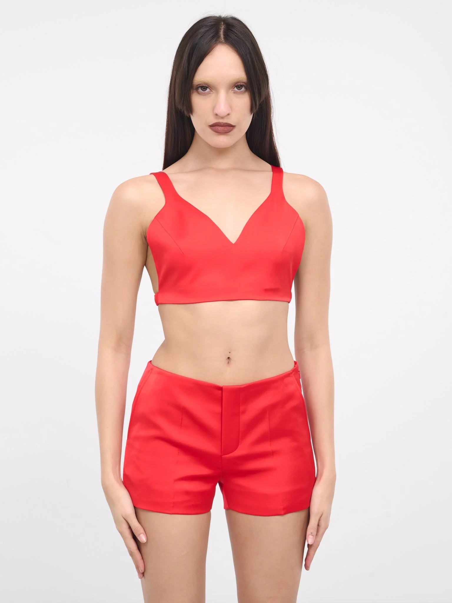 WE11DONE bra in red, paneled satin construction, sweetheart neckline, adjustable shoulder straps, sleeveless, armscyes, back elasticated band, straight hem, cropped length, slim fit. Made in Korea 100% Polyester Standard Sizing Model is 5'8" wearing size XS. Bust: 32" Waist: 26" Hips: 34.5"