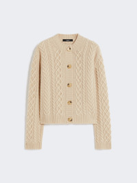 DETAILS Cardigan embellished with an Aran-inspired cable knit. Pure wool yarn cardigan Regular fit Crew neck Long set-in sleeves Button fastening at the front Ribbed trim COMPOSITION AND CARE 100% virgin wool. Hand wash cold (40°c max); do not bleach; do not tumble dry; flat drying in the shade; cool iron; professionally dry clean perchloroethylene - mild process; do not wet clean.; iron with a cloth between.; using neutral detergent. Distributed by Max Mara S.r.l., registered office in Reggio Emilia (Italy), Via Giulia Maramotti 4, 42124 (IT)