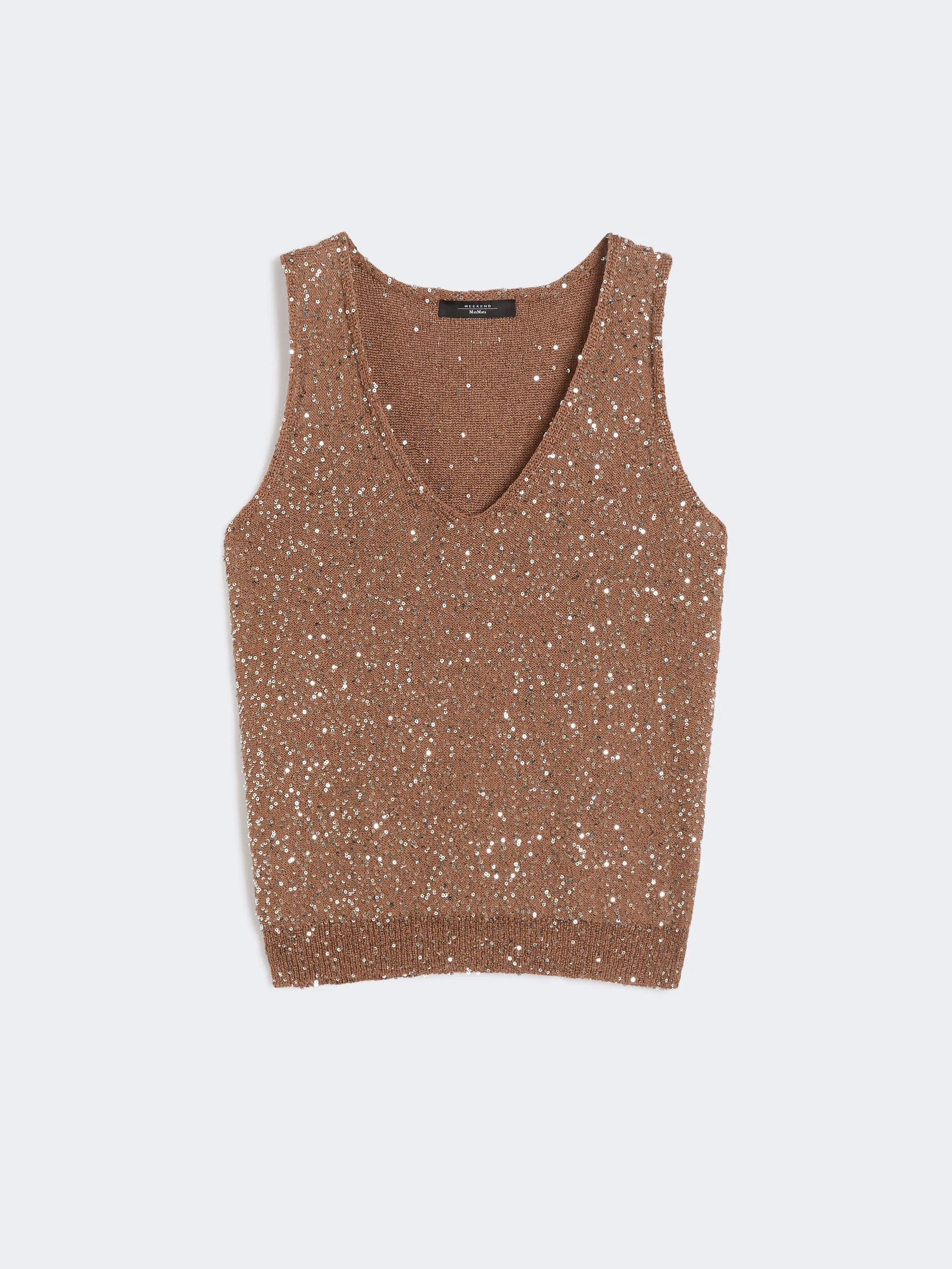 DETAILS Sleeveless top featuring all-over sequin-embroidered detail. Cotton-blend yarn top Relaxed fit V-neck front Regular length Rib-knit trim COMPOSITION AND CARE Knitted fabric 86% polyamide, 13% cotton, 1% polyester; - exclusive of decoration. Hand wash cold (40°c max); do not bleach; do not tumble dry; flat drying in the shade; cool iron; professionally dry clean perchloroethylene - mild process; do not wet clean.; iron with a cloth between.; using neutral detergent. Distributed by Max Mara S.r.l., registered office in Reggio Emilia (Italy), Via Giulia Maramotti 4, 42124 (IT)