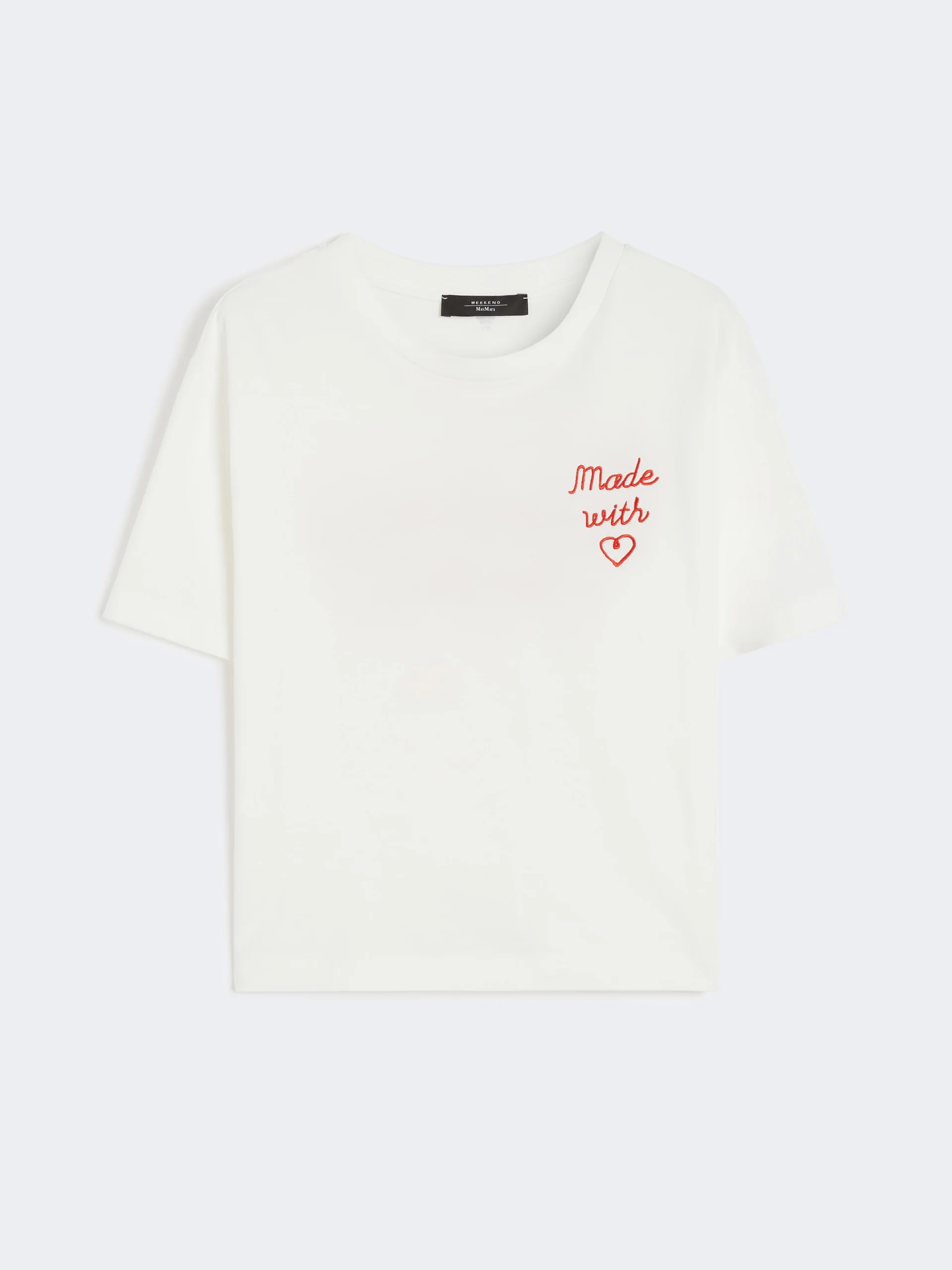 DETAILS Basic T-shirt customised with all-over print detail and embroidery on the left sleeve. T-shirt in pure organic cotton jersey fabric Boxy fit Rib-knit crew neckline Drop-shoulder short sleeves COMPOSITION AND CARE Jersey fabric 100% cotton; - exclusive of embroideries. Hand wash cold (40°c max); do not bleach; do not tumble dry; flat drying in the shade; cool iron; do not dry clean; do not wet clean.; iron with a cloth between.; using neutral detergent.; turn the articles inside out before washing.; to be ironed on reverse. Distributed by Max Mara S.r.l., registered office in Reggio Emilia (Italy), Via Giulia Maramotti 4, 42124 (IT)