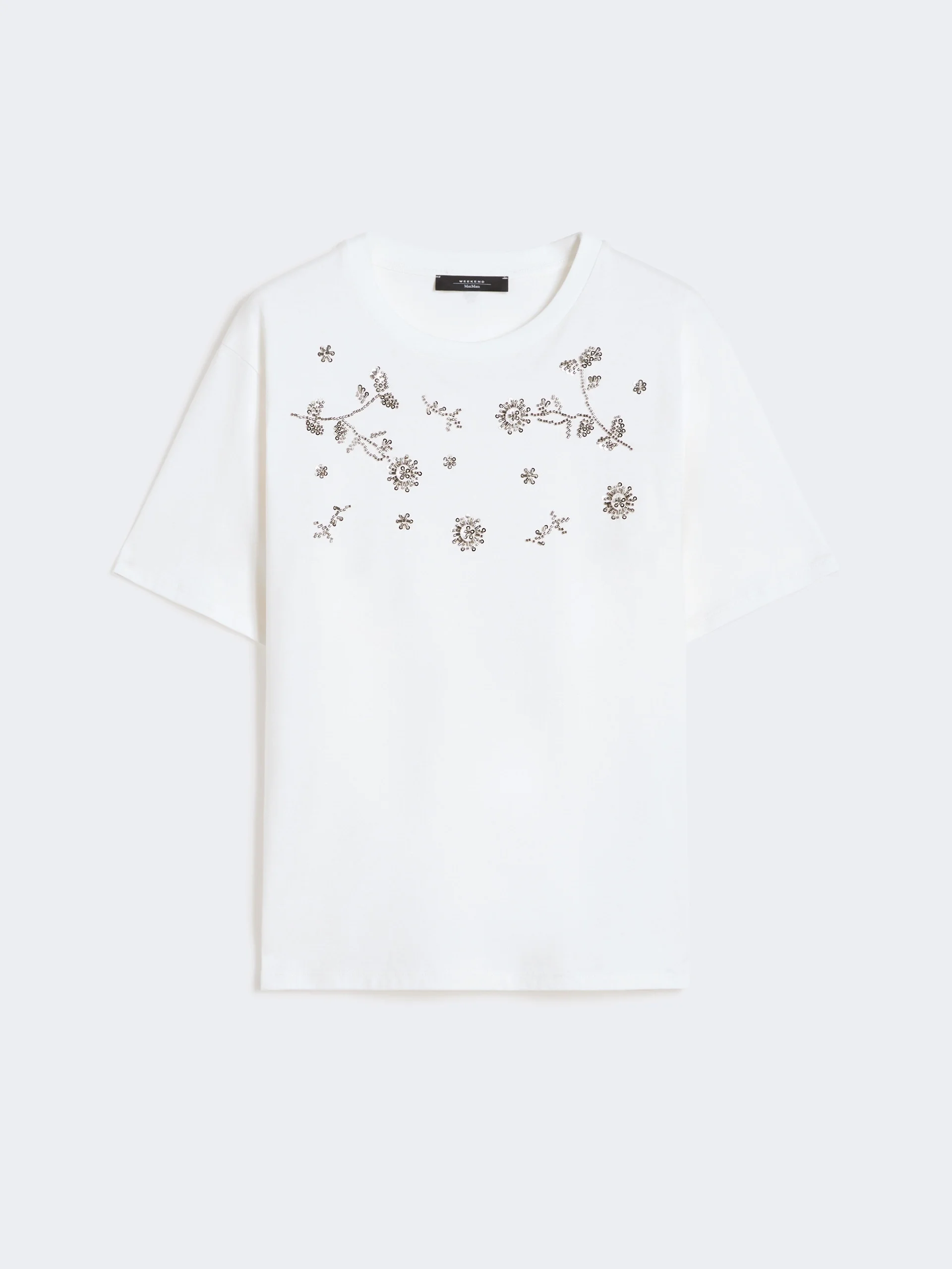 DETAILS Basic T-shirt customised with print and embroidered detail on the front. - Pure cotton jersey T-shirt - Straight fit with side slits - Rib-knit crew neckline - Short set-in sleeves - Small embroidered butterfly logo detail on the back of the neck COMPOSITION AND CARE Jersey fabric 100% cotton; - exclusive of decoration. Hand wash cold (40°c max); do not bleach; do not tumble dry; flat drying in the shade; cool iron; do not dry clean; do not wet clean.; iron with a cloth between.; using neutral detergent.; don’t rub.; turn the articles inside out before washing.; to be ironed on reverse.; do not iron the decoration. Distributed by Max Mara S.r.l., registered office in Reggio Emilia (Italy), Via Giulia Maramotti 4, 42124 (IT) Collection: Weekend Max Mara Product code: 5971066106003 - WKDAGILE