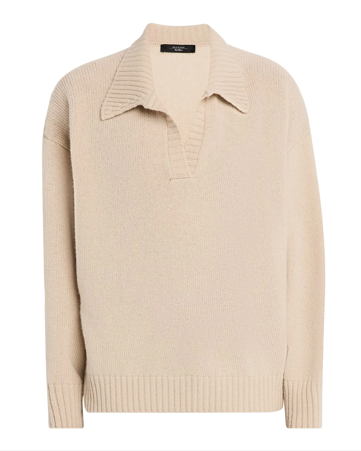 This Weekend Max Mara "Agre" polo sweater is plainknit in wool in a comfortably relaxed fit V neckline with spread collar Drop shoulders Long sleeves Relaxed fit Pullover style Virgin wool Hand wash Imported