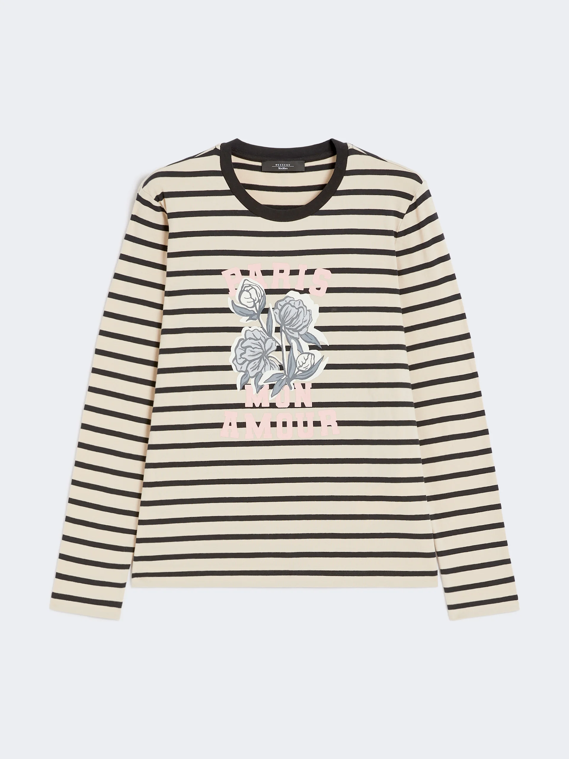 DETAILS Long-sleeved T-shirt with collection motif printed on the front. T-shirt in stretch-cotton jersey Figure-hugging Crew neck Set-in sleeves Butterfly logo on the back of the neck COMPOSITION AND CARE 95% cotton, 5% elastane. Hand wash cold (40°c max); do not bleach; do not tumble dry; flat drying in the shade; cool iron; do not dry clean; do not wet clean.; iron with a cloth between.; using neutral detergent.; don’t rub.; turn the articles inside out before washing.; to be ironed on reverse. Distributed by Max Mara S.r.l., registered office in Reggio Emilia (Italy), Via Giulia Maramotti 4, 42124 (IT)
